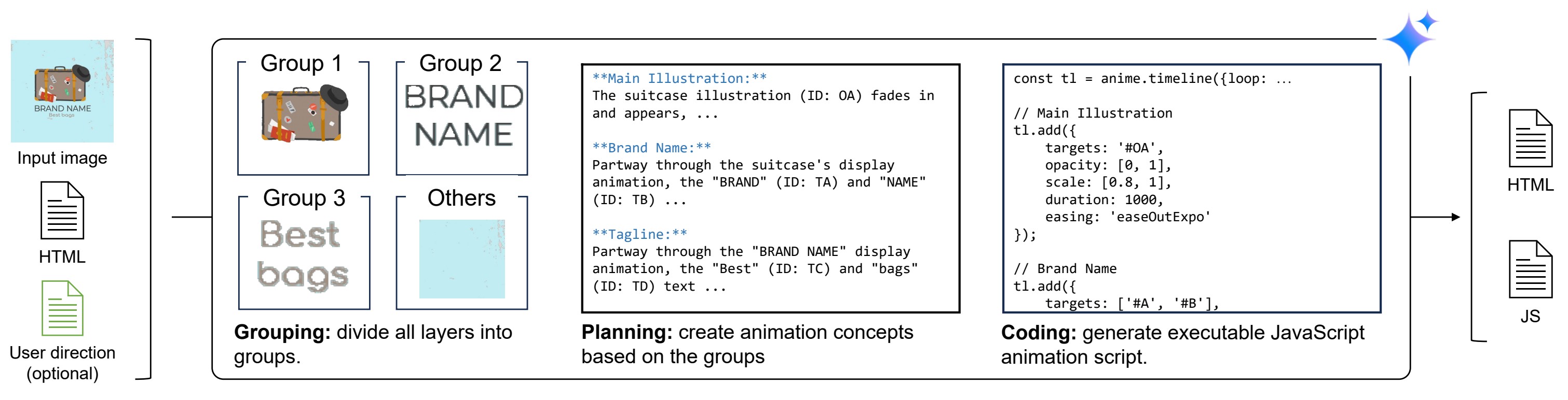 MG-Gen also generates an executable JavaScript animation script for the reconstructed HTML data using an LMM. Animation script generation pipeline consist of three main process: layer grouping, animation planning, and script coding. Grouping: The model first organizes the input HTML's layers into distinct clusters to understand its structure. Planning: Next, the model creates a detailed animation plan for each group, outlining the sequence and style of animations. Coding: Finally, the model generates an executable JavaScript animation script using Anime.js based on the plan. Once the animation script is generated, the animation script and HTML are rendered on a web browser to obtain a video file.