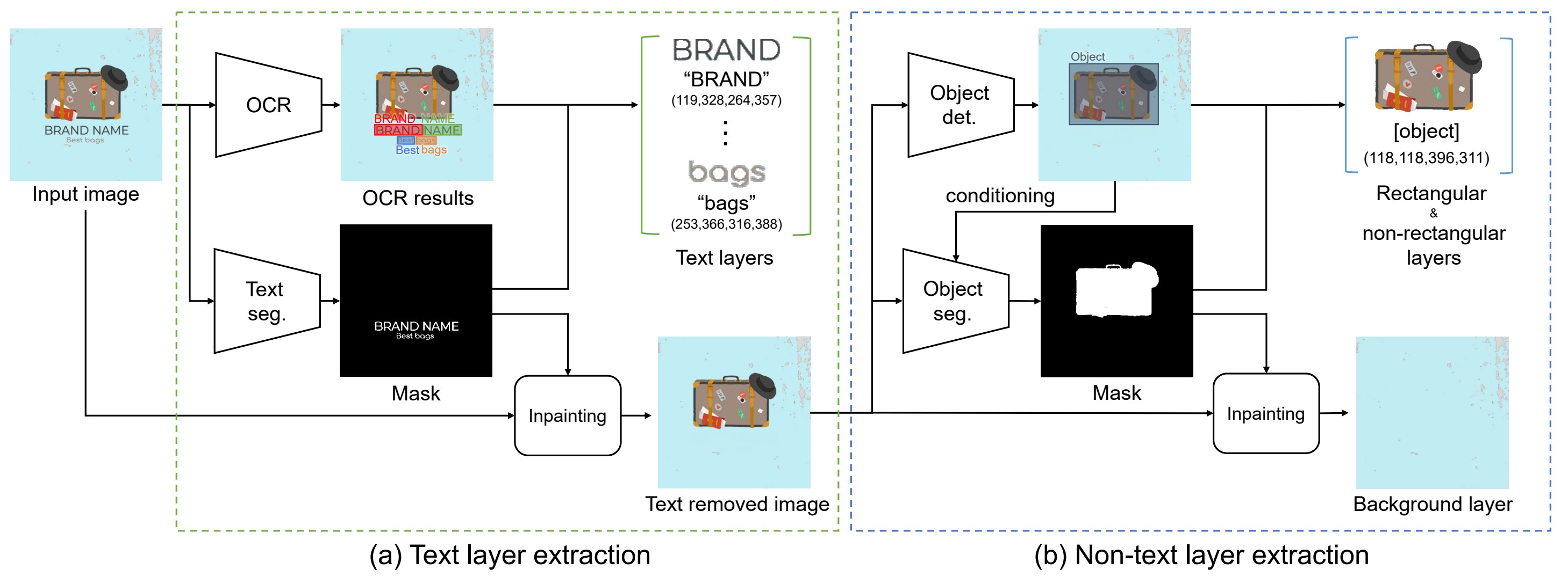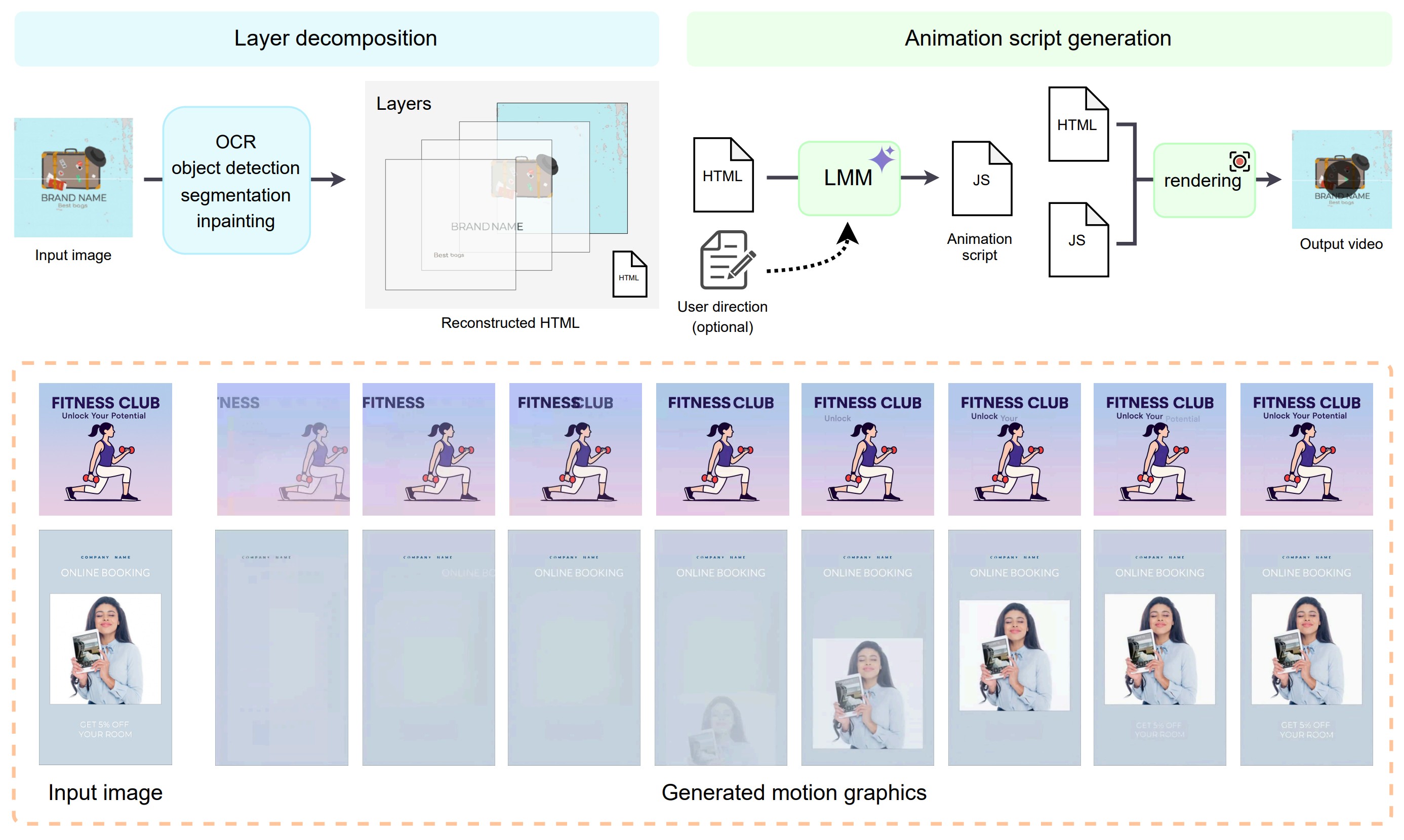 MG-Gen first decomposes an input image into layer-wise components using an OCR, object detection, object segmentation, and image inpainting then reconstructs the extracted layers as HTML data, which appears identical to the input image. Subsequently, it generates executable animation script for the HTML using a large multimodal model, specifically Gemini, which has shown high coding capabilities, coupled with its advanced reasoning abilities. The details of layer decomposition are as follows. First, only text layers are extracted using an OCR model and a text stroke segmentation model, Hi-SAM. Next, non-text layers are extracted using object detection model, YOLO, and segmentation model, SAM. Finally, an image inpainting model is applied to generate the background behind the extracted components, creating a separate background layer. After the all layer decomposition, we reconstruct the layer-decomposed data into HTML.